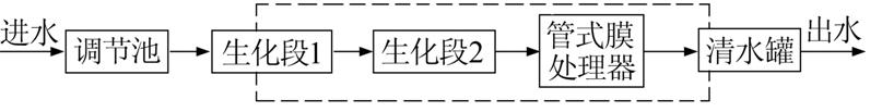 圖 1中回注水處理工藝流程中虛線部分為車載部分。工藝流程重點對工藝流程生化段1、生化段2、管式膜處理器詳細說明〔2, 3, 4〕,具體工藝流程見圖 2。