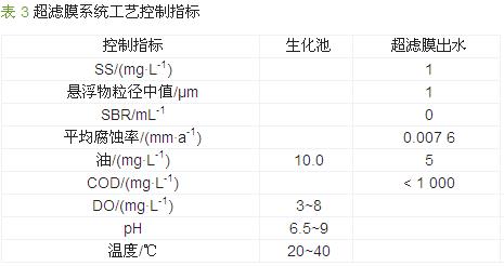超濾膜采用德國BERGHOF膜組件,膜道8 mm,膜孔30 nm。經(jīng)生化處理后的含油廢水由進水泵打入超濾膜系統(tǒng),膜系統(tǒng)產(chǎn)水經(jīng)轉子流量計計量后排入凈水罐,部分濃水回流至生化系統(tǒng),部分濃水由循環(huán)泵與進水混合重新進入超濾膜〔7〕。超濾膜處理系統(tǒng)流程見圖 3。工藝控制指標見表 3。
