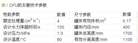 CFU的浮選罐外形尺寸為D 0.4 m×1.7 m,微氣泡發(fā)生器外形尺寸為D 76 mm×700 mm。現(xiàn)場試驗(yàn)時CFU采用2個立式氣浮罐串聯(lián)成撬,總體尺寸為1 430 mm×1 200 mm×2 370 mm,凈重≤1.5 t。其他參數(shù)如表 1所示。