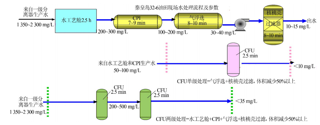 由圖5可以看出,單級CFU在入口含油50~100 mg/L、水力停留時間2.5 min時的處理效果與現(xiàn)場應(yīng)用氣浮選+核桃殼過濾相當(dāng),設(shè)備體積可減少50%以上;采用兩級CFU串聯(lián),在入口含油1 350~ 2 300 mg/L、總水力停留時間為5 min時的處理效果與現(xiàn)場應(yīng)用水工藝艙+斜板除油器+氣浮選+核桃殼過濾的效果相當(dāng),設(shè)備體積可減少50%以上。顯然,采用CFU可以減少水處理設(shè)施的串聯(lián)級數(shù)或大大減小設(shè)備體積,這對于海上油田而言極具應(yīng)用優(yōu)勢。